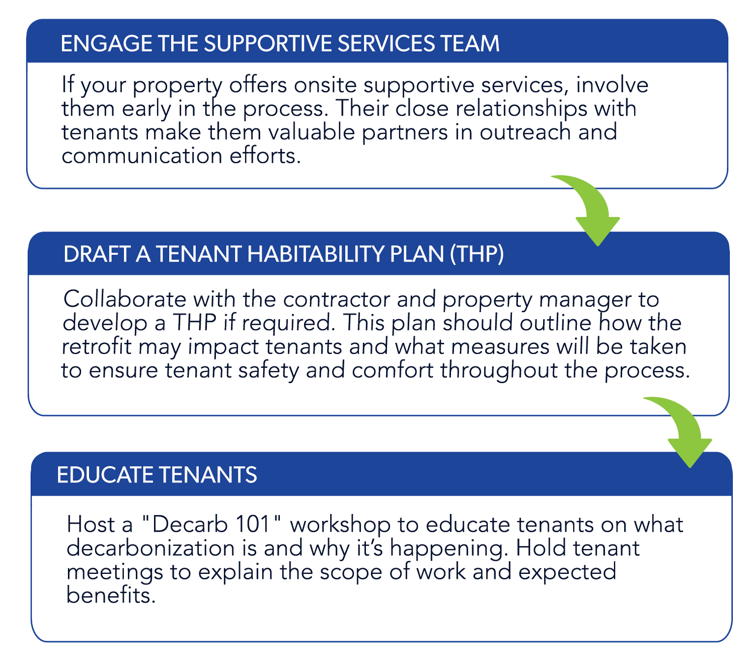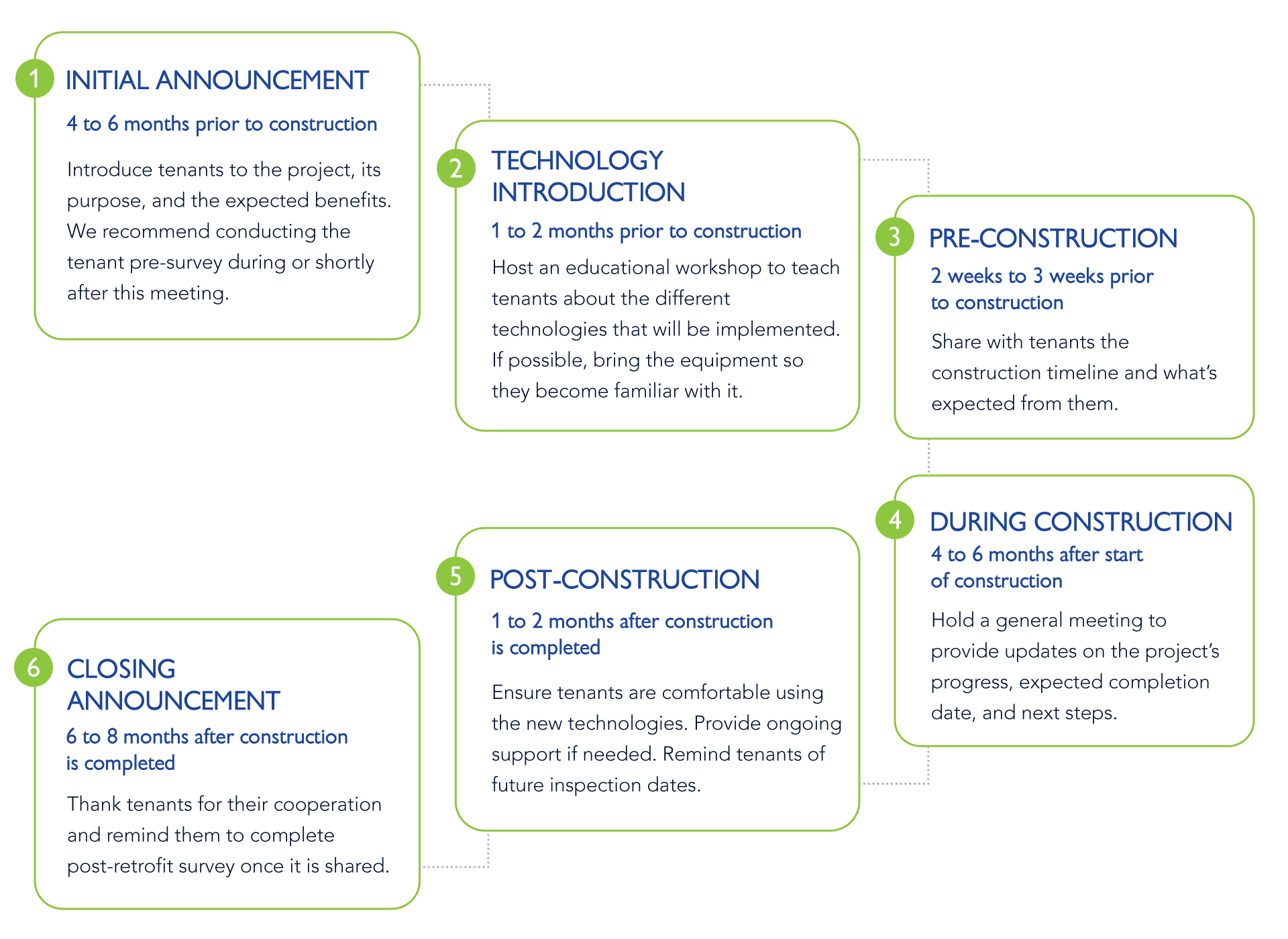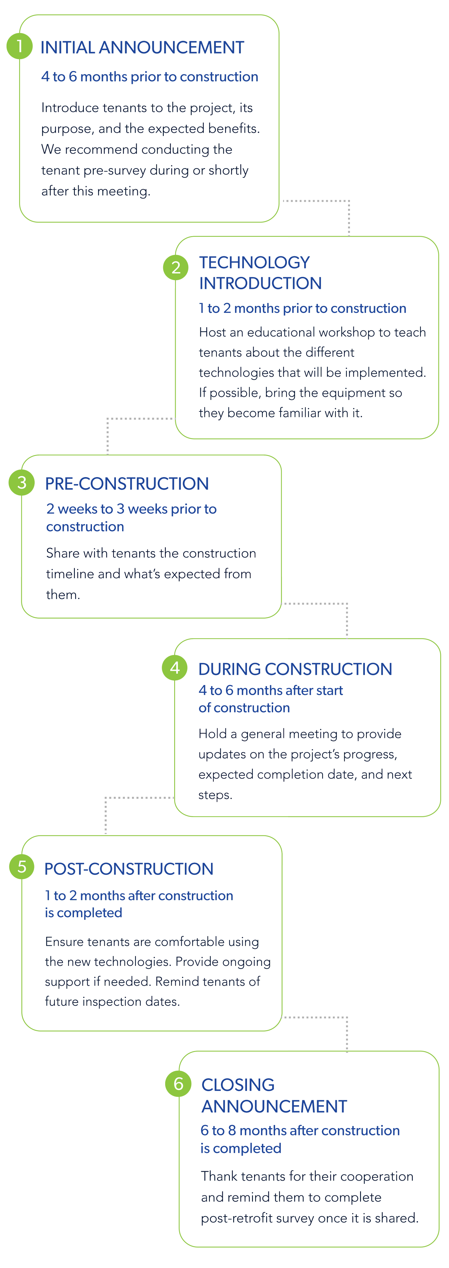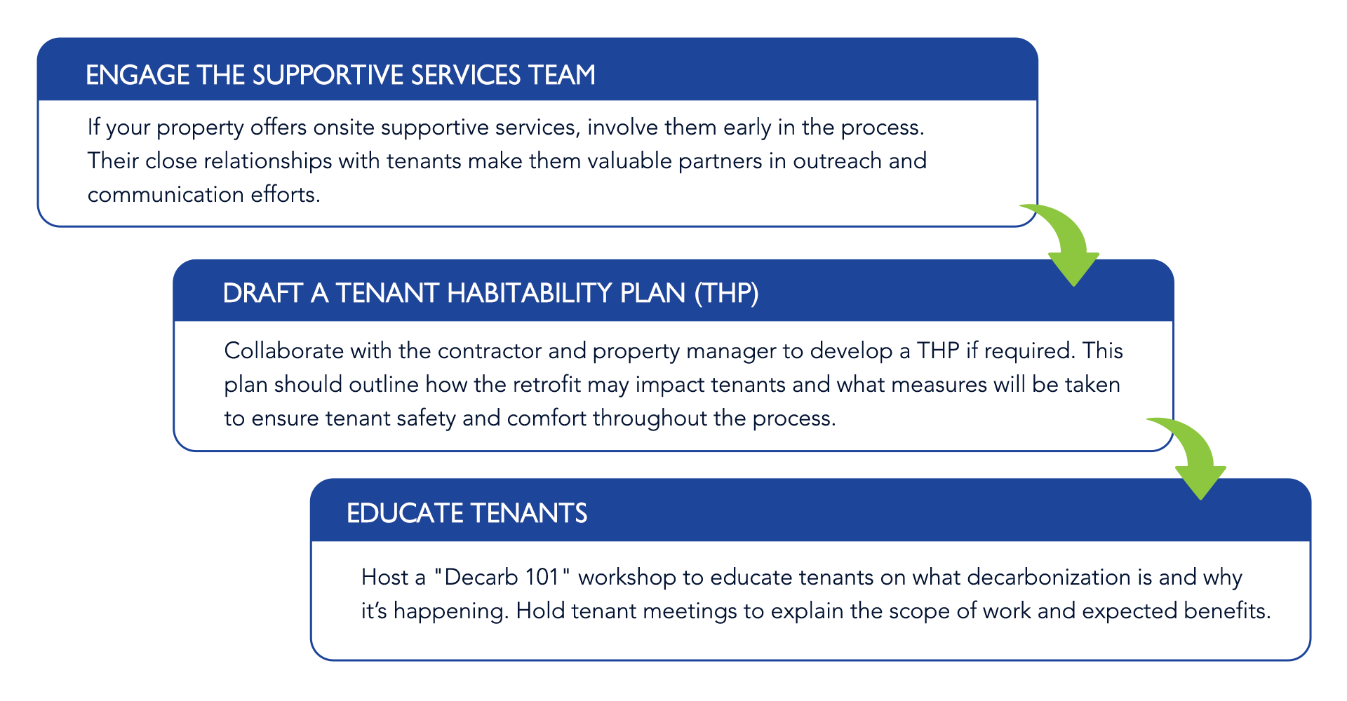 Use the following flowchart to help you schedule tenant meetings at key stages of the decarbonization process.